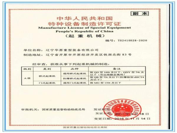 遼寧華原重型裝備有限公司成立于 2011 年 4 月,注冊(cè)資金 2.7 億元。作為遼寧省起重機(jī)械制造產(chǎn)業(yè)基地的龍頭企業(yè),是一家以橋式、門式起重機(jī)、散料 輸送設(shè)備、智能立體車庫等產(chǎn)品的設(shè)計(jì)、制造與銷售為主的大型裝備制造企業(yè)。